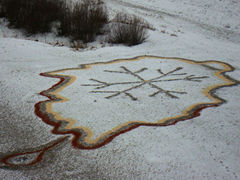 Mit großer Spannung wurden die möglichen Feldveränderung, und der eventuellen Zu- oder Abnahme der Boviswerte erwartet. In der Mitte seines 55 x 35 Meter großen land-art Bildes stellt eine Eisblume das ewig geglaubte Eis dar. Am unteren Ende Grönlands symbolisierte ein etwa 9 Meter großer Tropfen das Ausbluten des Eises.
